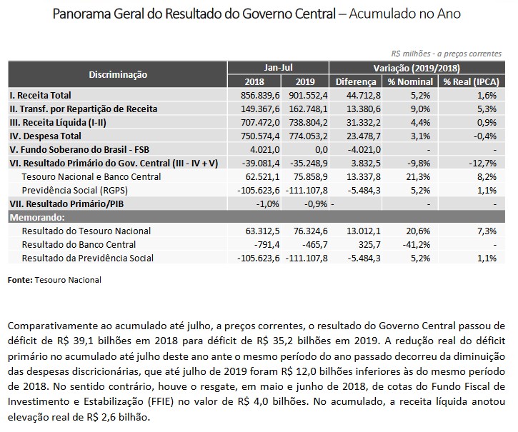Nos sete meses do ano, o Governo Central registrou déficit primário de R$ 35,249 bilhões. Em 2018, o déficit acumulado nos sete primeiros meses atingiu R$ 39,081 bilhões.