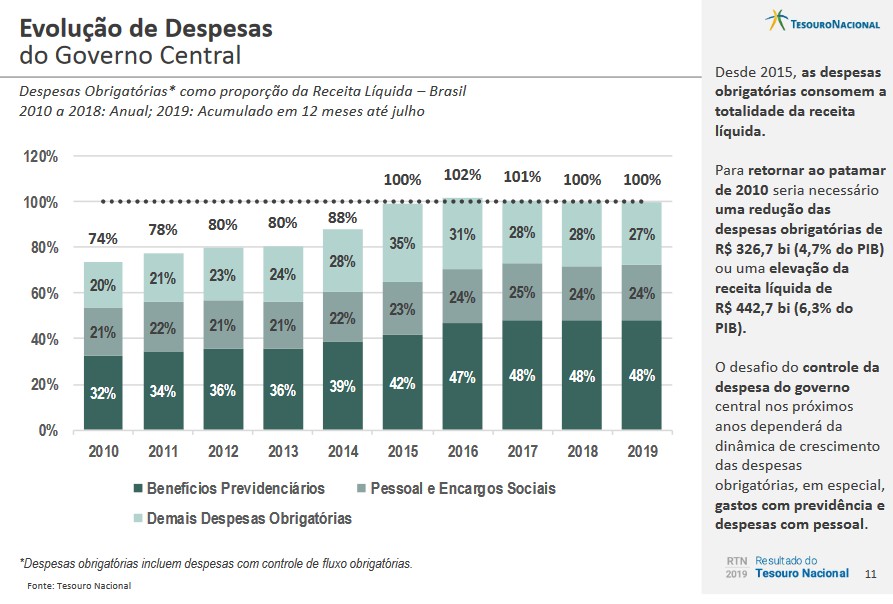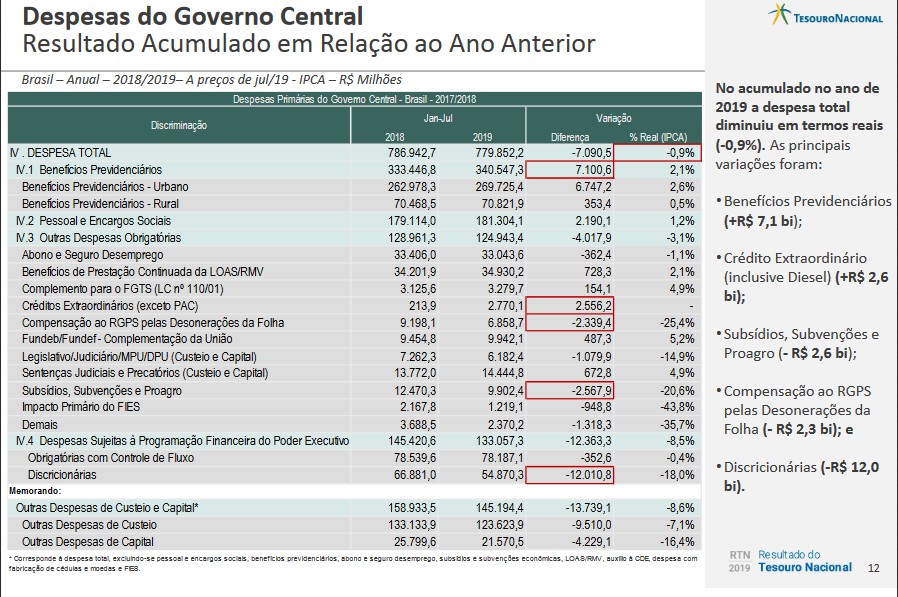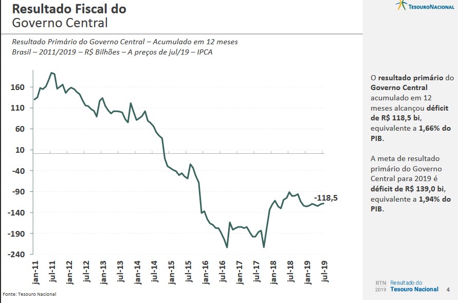 Segundo o Tesouro, a redução do déficit primário no acumulado até julho decorreu da “diminuição das despesas discricionárias (não obrigatórias) que, até julho de 2019, foram R$ 12 bilhões inferiores às do mesmo período de 2018”. Além disso, no acumulado, a receita líquida apresentou elevação real de R$ 2,6 bilhões.