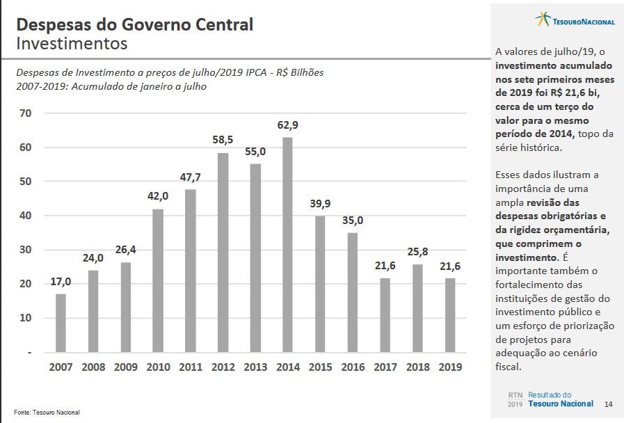 Os números mais preocupantes informados hoje, no relatório do Tesouro Nacional sobre as contas públicas, são o baixíssimo nível de investimento no acumulado de 12 meses até julho de 2019, de apenas 0,71% do PIB. Em valores, foram apenas R$ 49,9 bilhões de investimentos nos últimos 12 meses, queda brutal sobre os 12 meses terminados em julho de 2018.