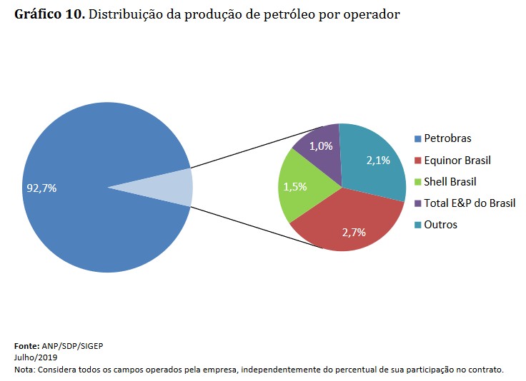 Tanto a produção de petróleo quanto a de gás natural aumentaram em julho de 2019 em relação ao mês anterior e ao mesmo período do ano passado. A produção de petróleo foi de 2,775 milhões de barris por dia (bbl/d), uma elevação de 8,5% frente a junho e de 7,8% em comparação a julho de 2018. Foram produzidos 124 milhões de metros cúbicos de gás natural por dia (m3/d), um crescimento de 11,7% frente ao mês anterior e de 7,1% na comparação com julho de 2018.