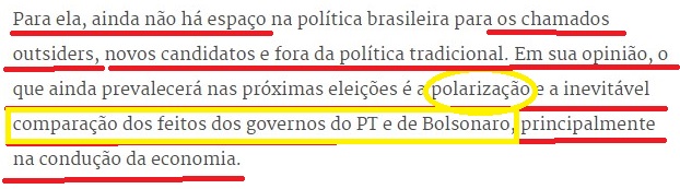 O que ela afirmou inclusive nos trechos achurados pelo blog é que ela não acredita em chances de candidato fora da política tradicional, que haverá comparação pelo eleitor na economia durante os governos atual e o petista, e que haverá polarização sem definir escopo de quem estará nos dois pólos. Eu concluí que pode ser qualquer um que apoiou os governos petistas (Flávio Dino, por exemplo, ou o próprio Ciro se deixasse de hostilizar o passado que ele apoiou), e que foi contra o golpe, contra qualquer um que defenda as políticas de Guedes aplicadas por Bolsonaro.