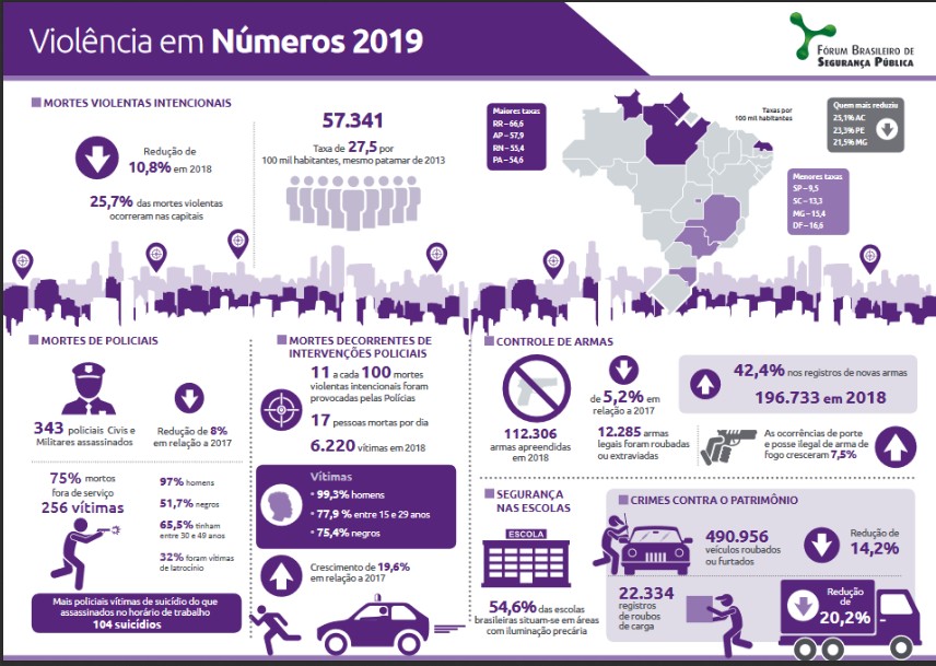 O Forum Nacional de Segurança Pública publicou hoje o Anuário Brasileiro de Segurança Pública 2019, com dados compilados até 2018. Você pode baixar a íntegra aqui.