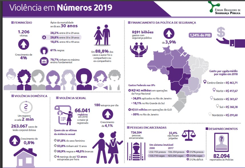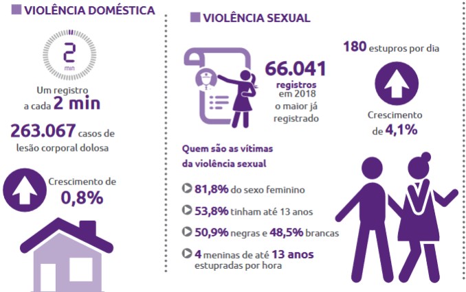 Outros números do relatório também mostram deterioração do quadro. A violência sexual, por exemplo, aumentou fortemente em 2018: 66 mil brasileiros, 82% mulheres, foram estuprados em 2018. Mais da metade, 54%, foram crianças com menos de 13 anos.
