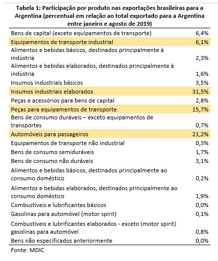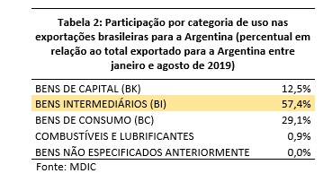 Muito se discute sobre a importância da Argentina para a indústria automobilística brasileira, afinal o país é o nosso principal parceiro comercial nesse setor. Contudo, a relevância da Argentina na pauta de exportações brasileiras vai muito além da demanda por automóveis. A Tabela 1 mostra que parte relevante do que é exportado do Brasil para a Argentina é composto por insumos industriais, isto é, partes e peças para compor a cadeia produtiva da indústria argentina. Hoje, quase 60% das nossas exportações para a Argentina é composta por bens intermediários, como mostra a Tabela 2.