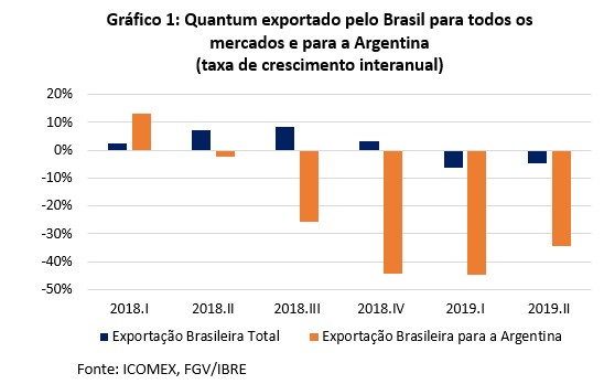 Segundo os dados do boletim ICOMEX, produzido pela FGV/IBRE, as exportações brasileiras para a Argentina começaram a cair no segundo trimestre do ano passado, contudo o impacto mais relevante foi sentido a partir do terceiro trimestre de 2018, atingindo o vale no primeiro trimestre deste ano, como mostra o Gráfico 1.