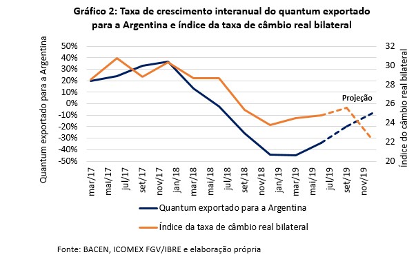 Para calcular o impacto previsto no terceiro e quarto trimestres deste ano, projetamos o crescimento do quantum exportado para a Argentina com base no cenário elaborado pelo FMI para o crescimento da demanda interna do país[1]. Construímos também um cenário para a evolução do câmbio real bilateral Real/Peso argentino, exibido no Gráfico 2.