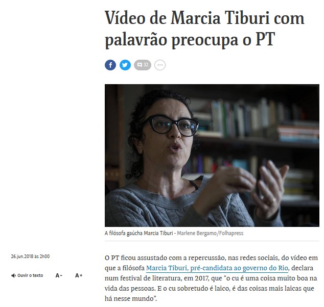 “O PT ficou assustado com a repercussão, nas redes sociais, do vídeo em que a filósofa Marcia Tiburi, pré-candidata ao governo do Rio, declara num festival de literatura, em 2017, que “o cu é uma coisa muito boa na vida das pessoas. E o cu sobretudo é laico, é das coisas mais laicas que há nesse mundo”.