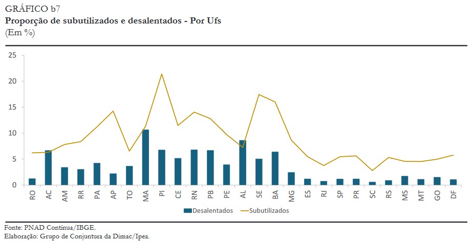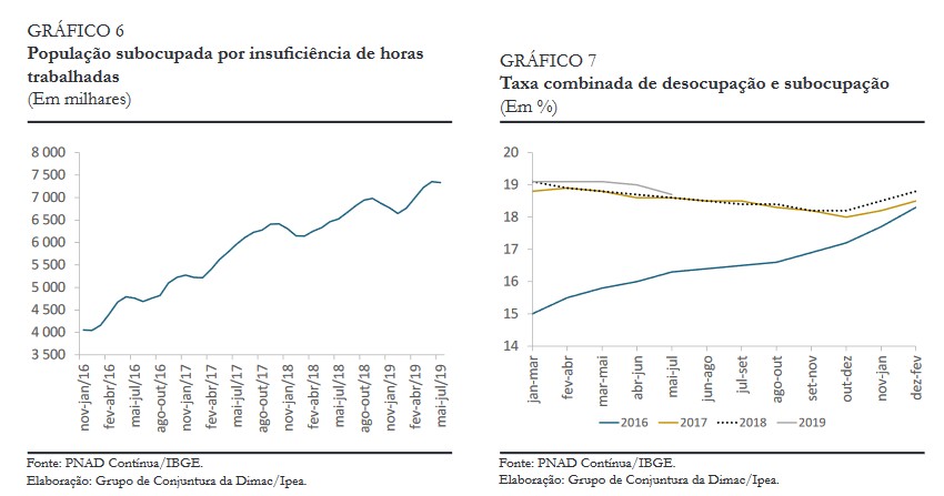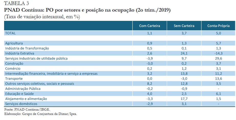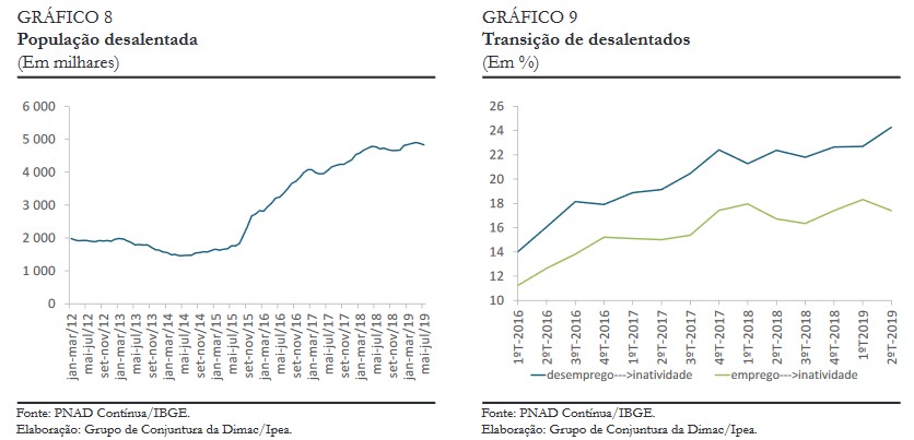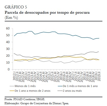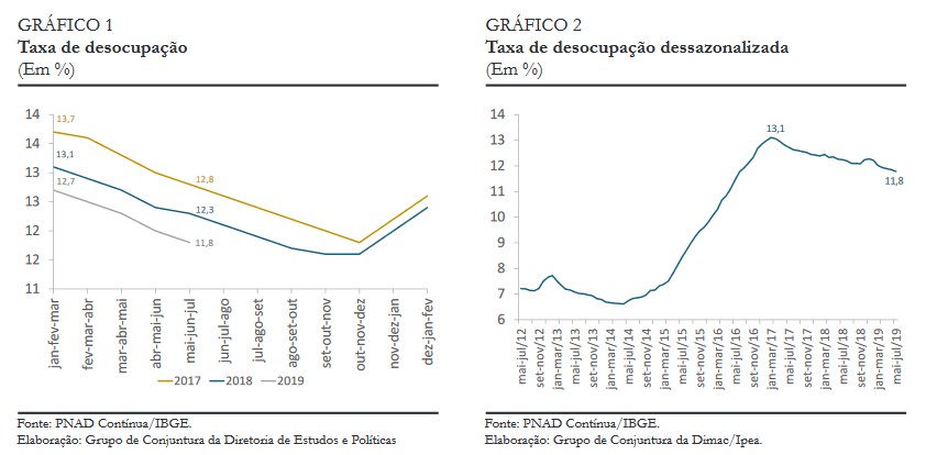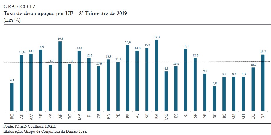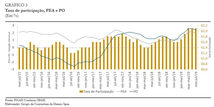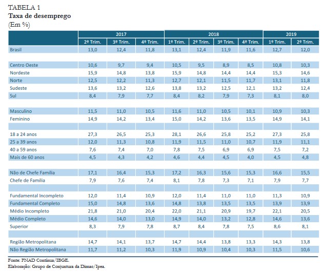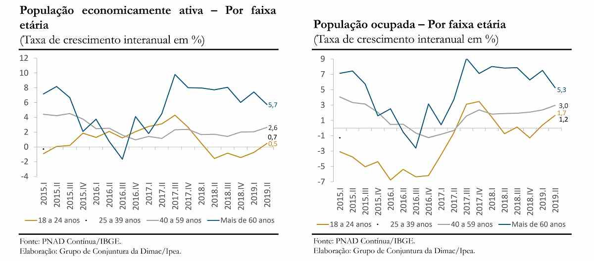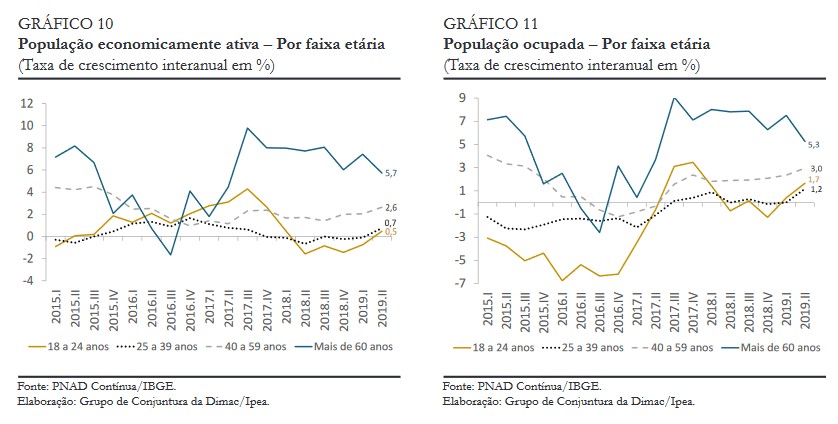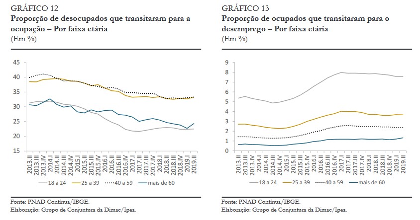 A pesquisa do Ipea traz ainda os dados abertos por faixa etária: no 2º trimestre de 2019, apenas o segmento dos trabalhadores com mais de 60 anos não apresentou recuo na taxa de desocupação, quando comparado ao mesmo período do ano anterior. Entre os trabalhadores mais jovens, ainda que com patamar elevado, o desemprego apontou maior retração em termos absolutos, passando de 26,6% para 25,8%, entre 2018 e 2019. Ao contrário dos trimestres anteriores, em que a queda da desocupação entre os jovens era decorrente, sobretudo, da contração da força de trabalho, no 2º trimestre de 2019 a expansão de 1,7% da ocupação foi a principal responsável por esta melhora de desempenho.