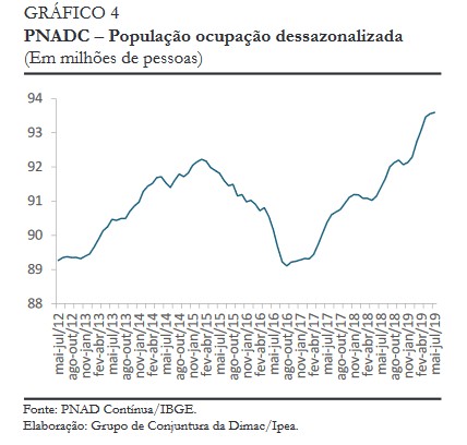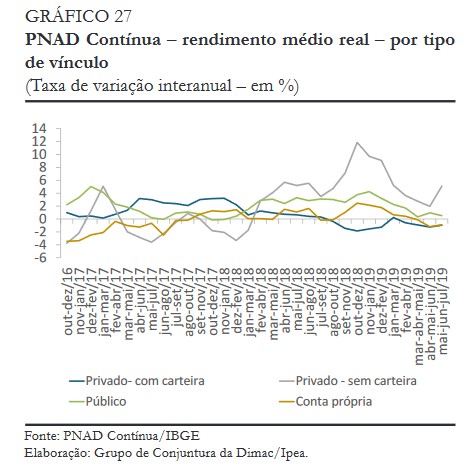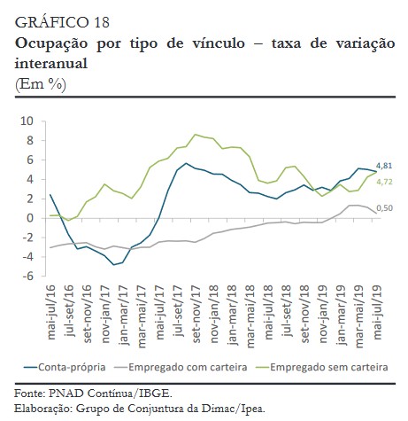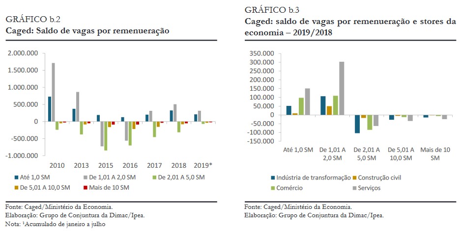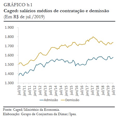 Por fim, os dados do Caged indicam que, a partir do 2º semestre de 2018, a geração de novos postos de trabalho com carteira assinada no país voltou a apresentar maior dinamismo, de modo que, no acumulado em 12 meses, até́ julho de 2019, a economia brasileira havia criado 521,5 mil novos empregos formais. Houve uma recuperação também dos salários médios de contratação, embora mantenham-se, historicamente, abaixo dos salários de demissão.
