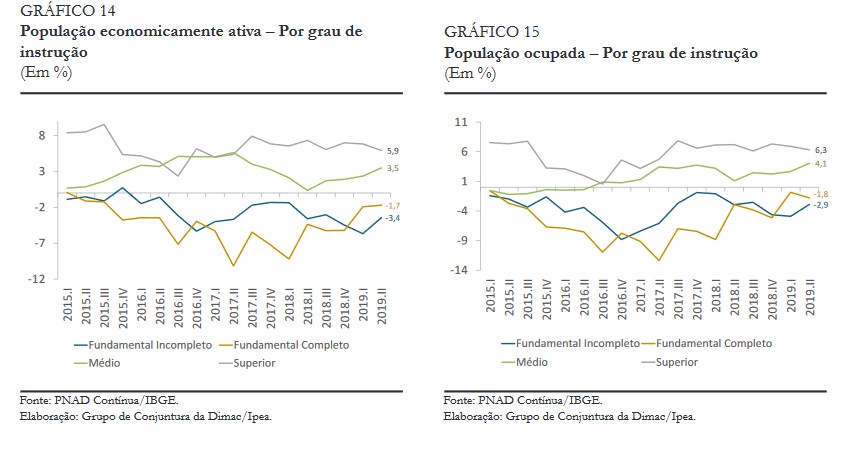 Já o recorte por grau de escolaridade sinaliza que, excetuando-se o grupo de trabalhadores com o ensino fundamental completo, todos os demais subgrupos registraram redução da desocupação no 2º trimestre de 2019. Embora a maior retração absoluta tenha ocorrido entre os trabalhadores com ensino médio incompleto (0,6 p.p.), em termos relativos, os recuos mais expressivos ocorreram nos segmentos extremos, ou seja, com instrução fundamental incompleta e superior. Deve-se ressaltar, no entanto, que a queda de 4% na desocupação de ambos os grupos foi gerada por movimentos distintos. Enquanto o recuo do desemprego entre os mesmos escolarizados veio de uma retração de 3,4% da força de trabalho diante de uma queda de 2,9% na ocupação, entre os mais educados a melhora da desocupação veio pela expansão da população ocupada (6,3%) e pelo ritmo superior à expansão da população economicamente ativa (5,9%).