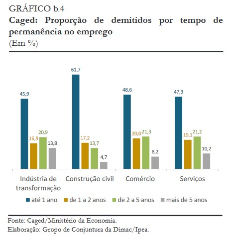 Na sua grande maioria, os trabalhadores demitidos são aqueles com menos tempo de permanência no emprego. Na média dos últimos 12 meses, enquanto na indústria, no comércio e nos serviços quase a metade dos demitidos estava trabalhando há́ menos de um ano, na construção civil esse percentual avança para 62%. Em contrapartida, a menor parcela dos trabalhadores dispensados é formada por aqueles que possuíam mais de cinco anos de permanência no emprego. Se na indústria de transformação essa parcela corresponde a 14%, na construção civil não chega a 5%.