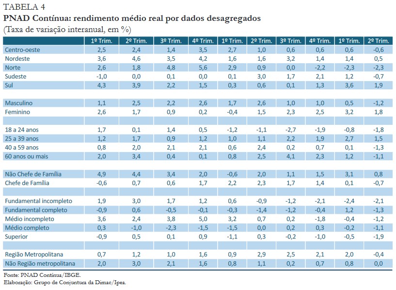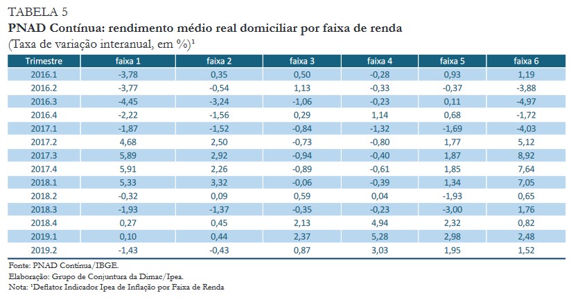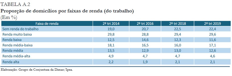 Enquanto as famílias de renda muito baixa registram um recuo de 1,4% nos seus rendimentos médios reais no 2º trimestre de 2019, o segmento mais rico da população aponta uma alta salarial de 1,5%, o que evidencia o aumento da desigualdade. Esta é uma das conclusões da seção de Mercado de Trabalho da Carta de Conjuntura do Instituto de Pesquisa Econômica Aplicada (Ipea), divulgada nesta quarta-feira, 18.