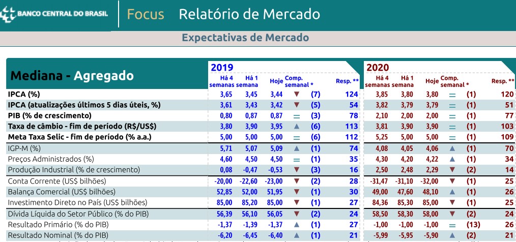 Em outubro de 2018, o boletim Focus previa que a indústria brasileira cresceria 3%; as previsões começaram a cair muito rapidamente a partir de fevereiro deste ano, e hoje os agentes econômicos entrevistados pelo Banco Central prevêem que a produção industrial será negativa em 0,53%