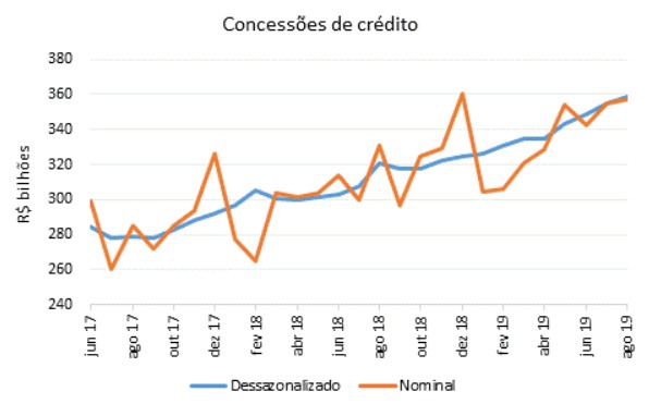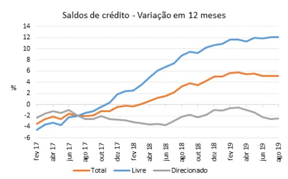 As concessões totais de crédito somaram R$357 bilhões em agosto. Na série com ajuste sazonal, houve expansão mensal de 1,1% (0,5% nas contratações com empresas e 0,2% com famílias). No acumulado do ano, comparado ao mesmo período do ano anterior, as concessões totais cresceram 11,5%, repercutindo evolução das contratações do segmento livre (+12,8%), composto por expansões de 14,2% em pessoas físicas e de 11% em pessoas jurídicas.