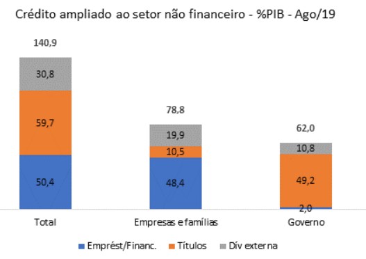 O crédito ampliado a empresas e famílias totalizou R$5,6 trilhões (78,8% do PIB), com expansões de 2,6% no mês e de 7,2% em doze meses. No mês, as principais contribuições para o crescimento do crédito ampliado a empresas e famílias foram da dívida externa, 8,5%, impactada pela desvalorização cambial, e dos empréstimos e financiamentos, 0,9%. Na comparação em doze meses, sobressaem os títulos de dívida, com variação de 31,1%.