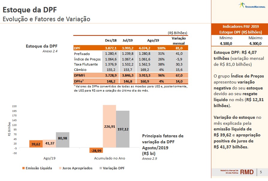 Segundo a Secretaria, a dívida pública federal de agosto subiu R$ 81 bilhões sobre o mês anterior, e atingiu R$ 4,07 trilhões. Deste total, 67% é dívida interna (DPMFi) e 14% dívida externa (DPFe).