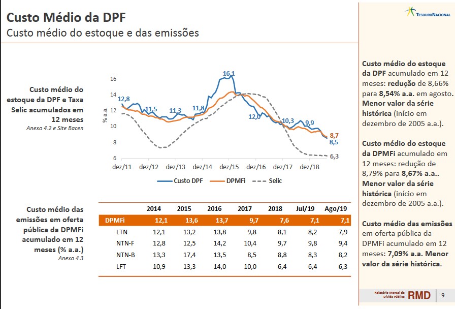Um aspecto positivo é que, em função da baixa na Selic, o custo médio da dívida tem caído muito, como se vê no gráfico acima.
