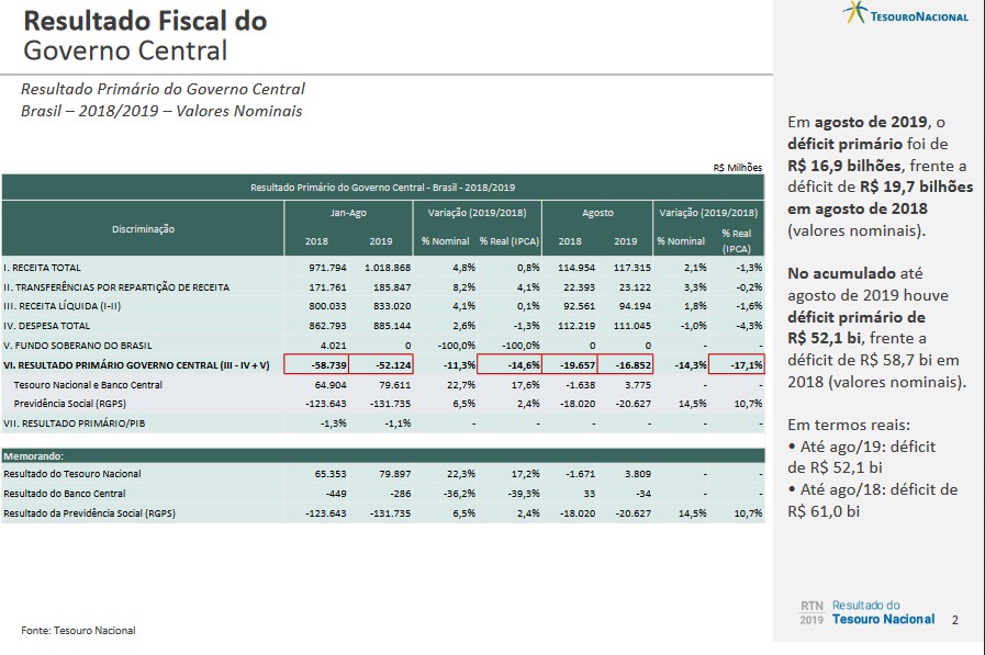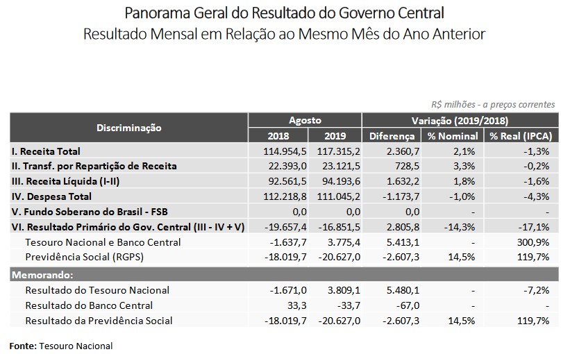Em agosto de 2019, o resultado primário do Governo Central foi um déficit de R$ 16,9 bilhões, frente ao déficit de R$ 19,7 bilhões observado no mesmo mês do ano anterior (em termos nominais).