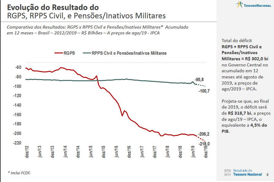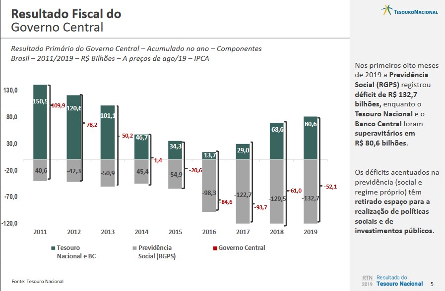 Com o resultado de agosto, o déficit primário acumulado neste ano é de R$ 52,1 bilhões, ante déficit de R$ 58,7 bilhões no mesmo período de 2018 (em termos nominais). Trata-se de uma melhora de 14,6% em termos reais, sendo ainda o melhor resultado acumulado para os oito primeiros meses do ano desde 2015. O resultado de 2019 é composto por um superávit de R$ 79,6 bilhões do Tesouro Nacional e do Banco Central e por um déficit de R$ 131,7 bilhões na Previdência Social (RGPS).