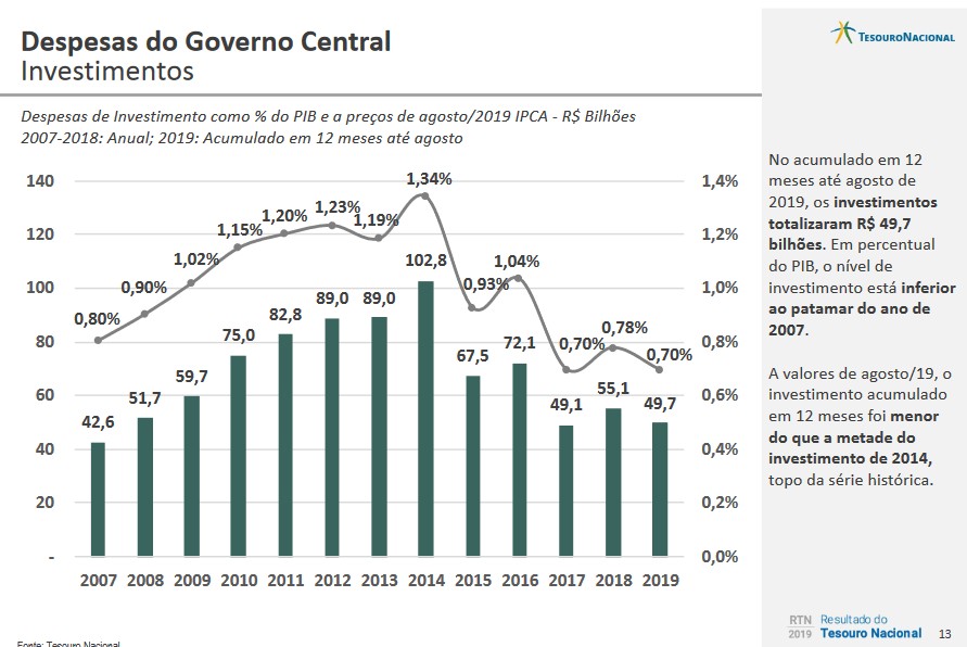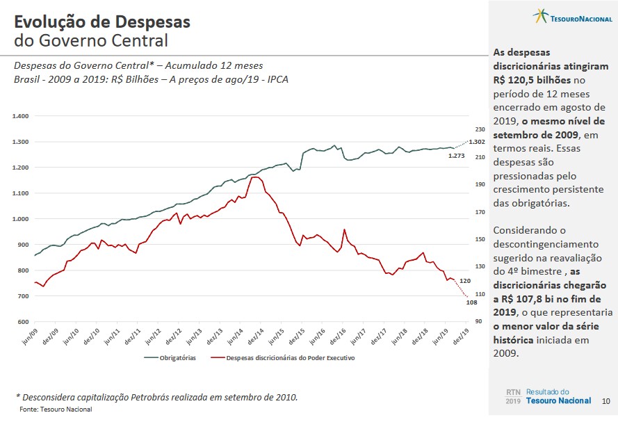 A redução real do déficit primário do Governo Central no acumulado até agosto deste ano ante o mesmo período do ano passado decorreu da diminuição das despesas discricionárias, que em 2019 foram R$ 13,2 bilhões inferiores às do mesmo período de 2018 e do aumento das receitas líquidas que anotaram elevação real de R$ 1,0 bilhão.