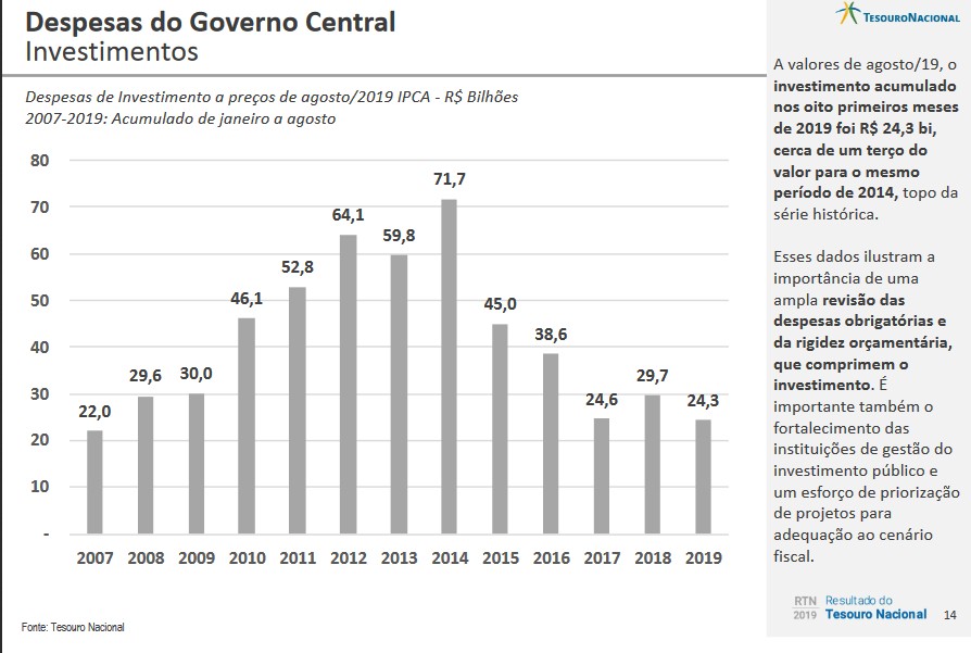 A melhora em relação a agosto de 2018 se deveu, principalmente, à redução de R$ 5,0 bilhões das despesas totais, em termos reais. Essa variação é explicada em sua maior parte pela redução de R$ 2,6 bilhões nas despesas obrigatórias com controle de fluxo e pelas despesas com financiamento de campanha eleitoral (R$ 1,8 bilhão) sendo esta última executada em agosto de 2018 sem contrapartida em 2019.