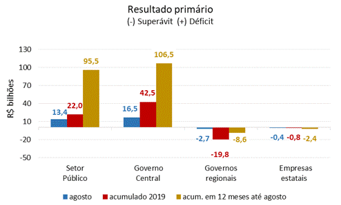 O setor público consolidado registrou déficit primário de R$13,4 bilhões em agosto, comparativamente a déficit de R$16,9 bilhões no mesmo mês de 2018. O Governo Central registrou déficit de R$16,5 bilhões, e os governos regionais e empresas estatais, superávits de R$2,7 bilhões e R$355 milhões, respectivamente.