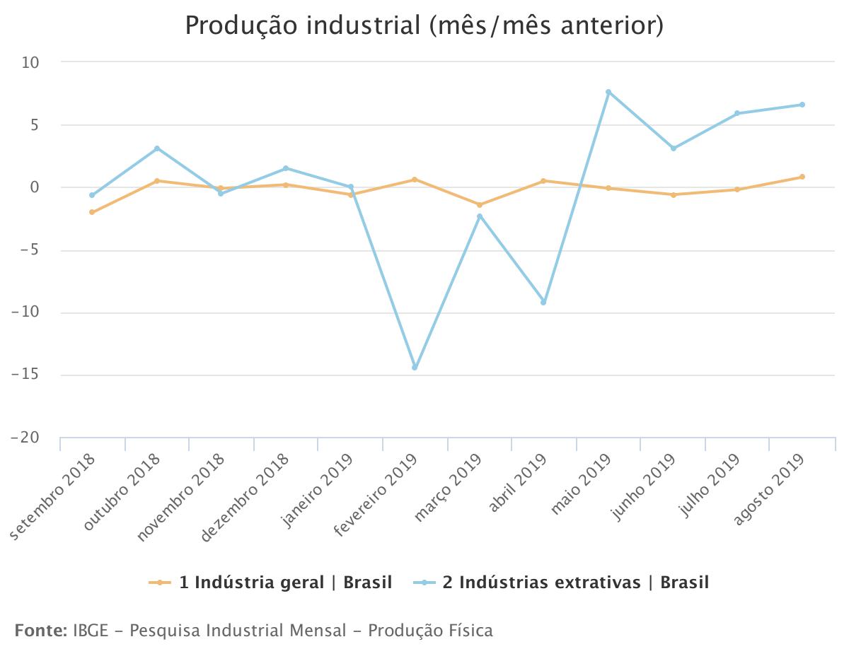 No crescimento de 0,8% da atividade industrial na passagem de julho para agosto de 2019, somente uma das quatro grandes categorias econômicas e 10 dos 26 ramos pesquisados mostraram expansão na produção. Entre as atividades, a influência positiva mais importante foi registrada por indústrias extrativas, que avançou 6,6%, quarta taxa positiva consecutiva, acumulando, assim, ganho de 25,2% nesse período. Vale destacar que esses resultados positivos interromperam três meses seguidos de queda na produção, período em que acumulou redução de 24,2%. Outros impactos positivos relevantes foram observados nos setores de coque, produtos derivados do petróleo e biocombustíveis (3,6%) e de produtos alimentícios (2,0%), com o primeiro assinalando avanço de 7,7% no período maio-agosto de 2019; e o segundo interrompendo três meses consecutivos de queda na produção, período em que acumulou perda de 3,0%.