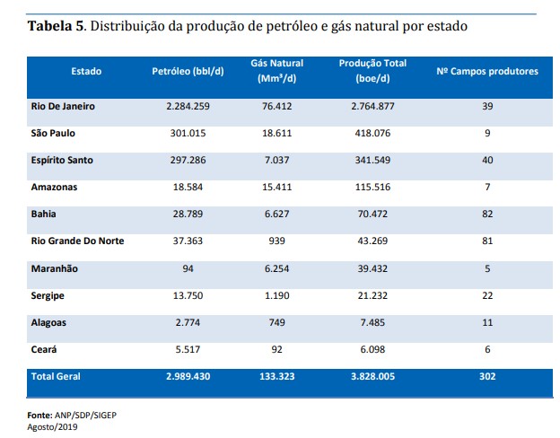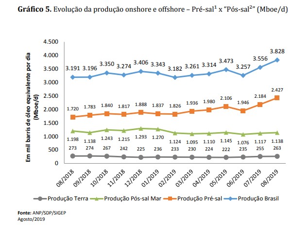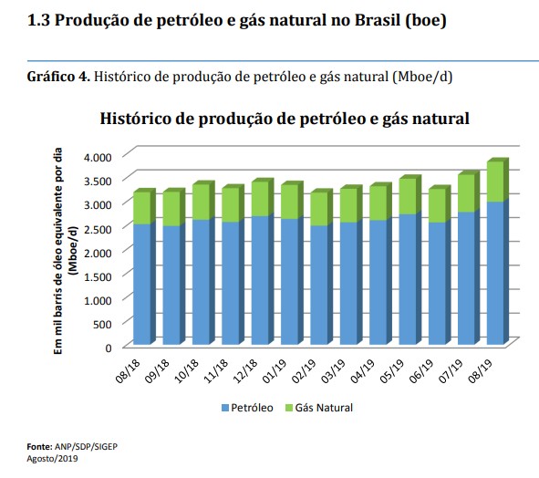 No mês de agosto de 2019, a produção de petróleo e gás natural no Brasil totalizou 3,828 milhões de barris de óleo equivalente por dia (MMboe/d).
