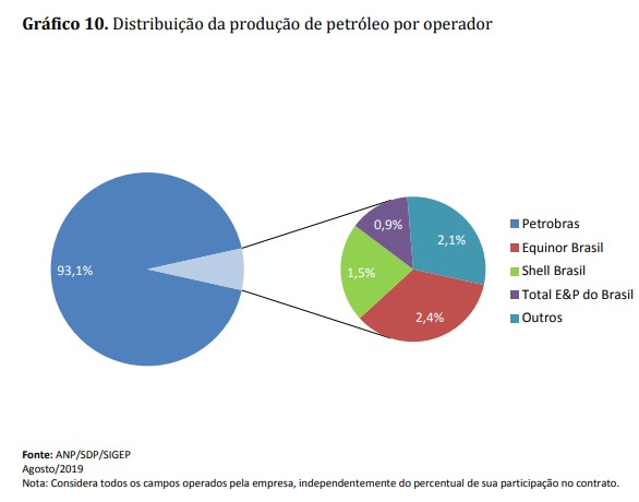 Em agosto de 2019, 295 áreas concedidas, duas áreas de cessão onerosa e cinco de partilha, operadas por 31 empresas, foram responsáveis pela produção nacional. Destas, 74 são marítimas e 228 terrestres. Do total das áreas produtoras, 10 são relativas a contratos de áreas contendo acumulações marginais.