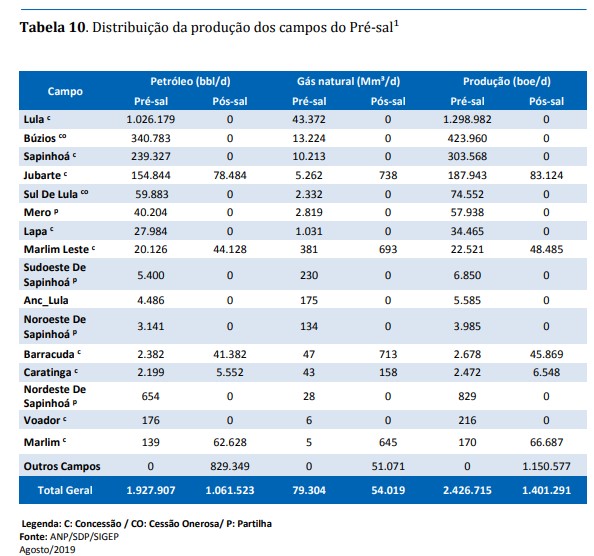 A produção do Pré-sal, oriunda de 110 poços, foi de 1,928 MMbbl/d de petróleo e 79,3 MMm³/d), de gás natural, totalizando 2,427 MMboe/d. Houve aumento de 11,1 % em relação ao mês anterior e de 41,1% se comparada ao mesmo mês de 2018. A produção do Pré-sal correspondeu a 63,4% do total produzido no Brasil.