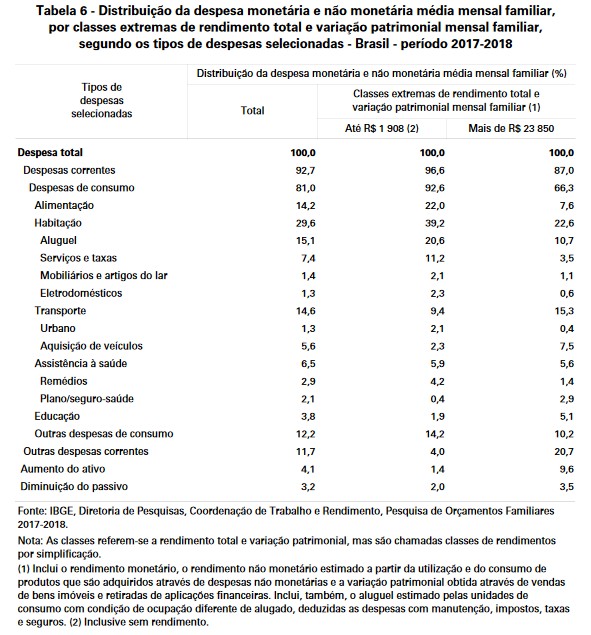 Somados, os dois grupos representam 61,2% das despesas das famílias com menores rendimentos, sendo 22% destinados à alimentação e 39,2% voltados à habitação. Entre aquelas com os rendimentos mais altos, a soma atinge 30,2%, sendo 7,6% com alimentação e 22,6% com habitação.