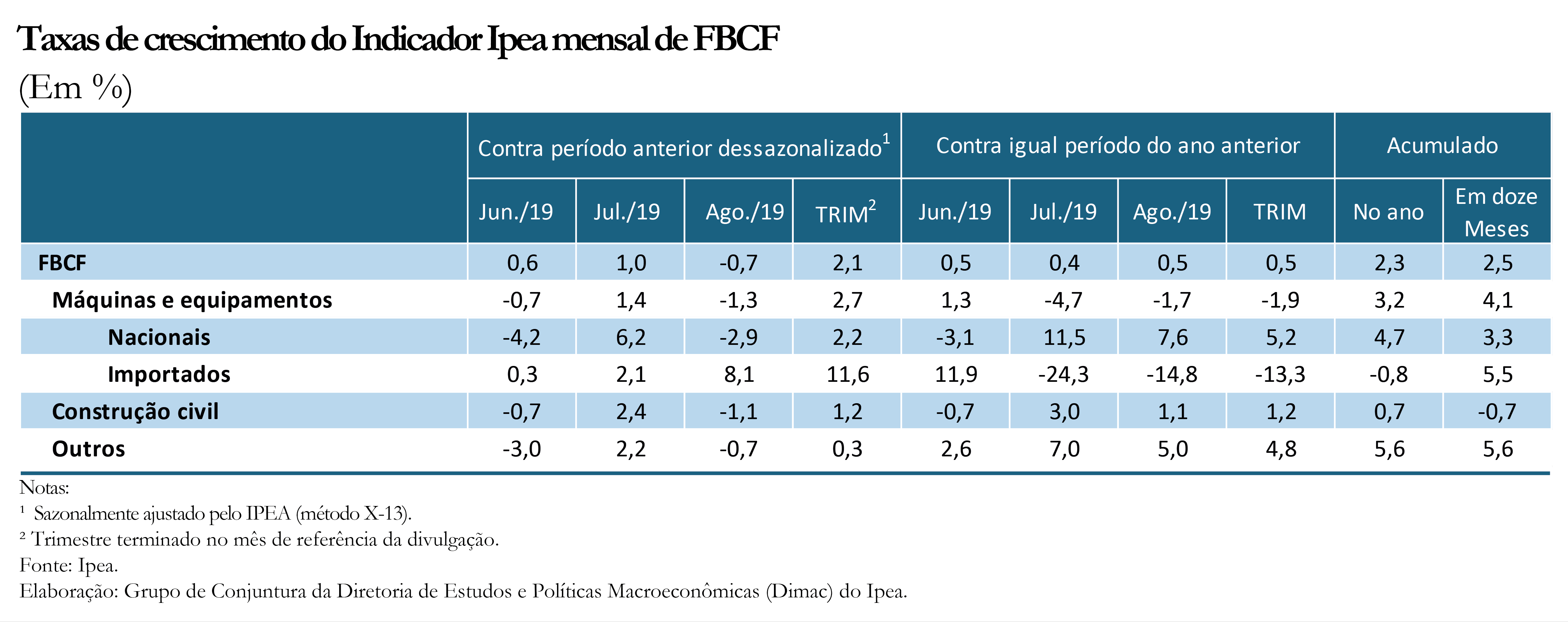 O Indicador Ipea de Formação Bruta de Capital Fixo (FBCF) aponta recuo de 0,7% na comparação entre os meses de agosto e julho de 2019, na série com ajuste sazonal, deixando um carregamento estatístico de 1,1% para o terceiro trimestre de 2019. Com esse resultado, o trimestre móvel terminado em agosto registrou alta de 2,1%, também na série dessazonalizada. Na comparação com o mesmo mês do ano anterior, a FBCF atingiu patamar 0,5% superior ao verificado em agosto de 2018. No acumulado em doze meses, os investimentos desaceleraram, com a taxa de crescimento passando de 3% para 2,5%.