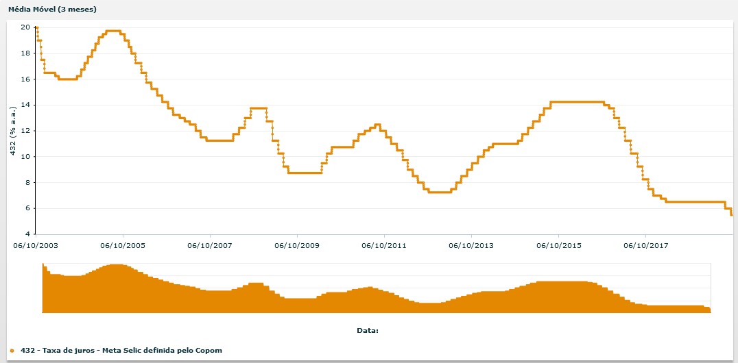 O primeiro gráfico abaixo mostra a queda da taxa Selic, que é a taxa de juros básica do país, determinada pelo Copom, órgão do Banco Central. Os dois gráficos seguintes trazem a evolução dos juros do cartão de crédito rotativo e do cheque especial para pessoas físicas. Os gráficos são atualizados até setembro de 2019.
