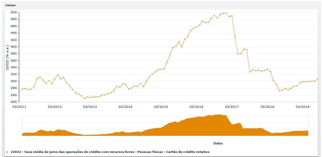 Observe que os juros do cartão de crédito iniciaram uma trajetória de alta a partir de meados de 2018, e continuam subindo.