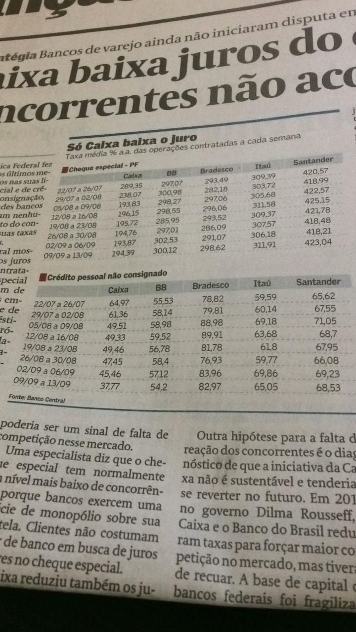 Deparo-me, no Valor, com uma reportagem sobre a queda de juros na Caixa, a qual não estaria sendo acompanhada pelos concorrentes.
