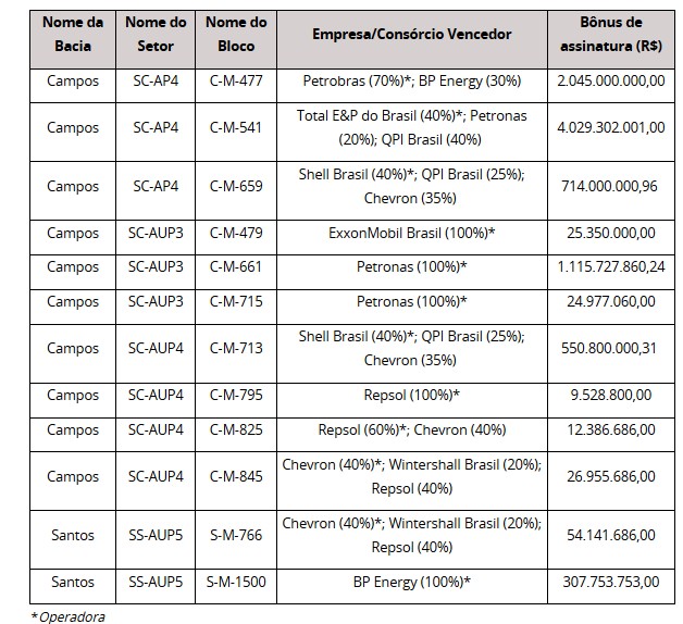 Foram arrematados 12 dos 36 blocos marítimos ofertados, com ágio médio de bônus de assinatura de 322,74%. O bloco C-M-541, na Bacia de Campos, teve o maior bônus de assinatura já ofertado para um bloco em rodadas de concessão, cerca de R$ 4,03 bilhões. Ao todo, 11 empresas, originárias de nove países, fizeram ofertas, sendo que dez arremataram blocos. A área total arrematada foi de cerca de 11,8 mil km².