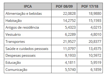 Com 377 produtos e serviços, a nova estrutura de ponderação do IPCA, baseada nos resultados da Pesquisa de Orçamentos Familiares (POF) 2017-2018, vai ser incorporada a partir dos resultados de janeiro de 2020, previstos para serem divulgados no início de fevereiro pelo IBGE. São seis subitens a menos que na estrutura atual, baseada na POF 2008-2009 e em vigor desde janeiro de 2012.
