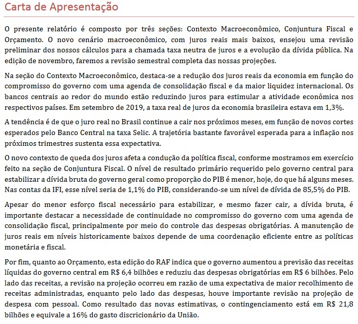 O Instituto Fiscal Independente (IFI) divulgou hoje o seu relatório de acompanhamento fiscal mensal, referente ao mês de outubro. Eu separei alguns gráficos e textos. Para baixar a íntegra, clique aqui.