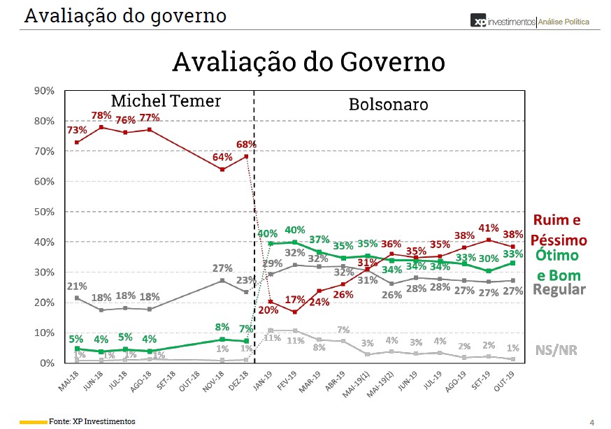Segundo a XP, o índice de ruim e péssimo caiu de 41% para 38%, e o de ótimo e bom subiu de 30% para 33%.
