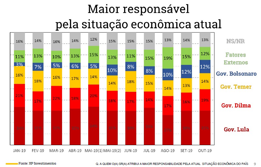 Houve ainda um pequeno aumento dos que consideram os governos Lula e Dilma como os principais responsáveis pela situação econômica atual: 50% dos entrevistados atribuíram a culpa dos males atuais aos governos petistas, contra 46% em setembro.