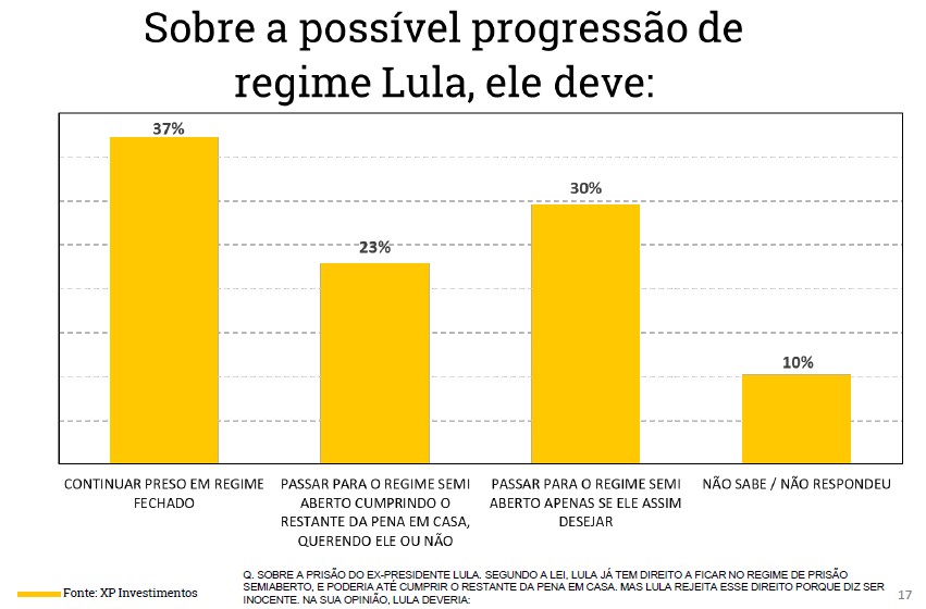 A pesquisa também perguntou sobre possível progressão do regime Lula: 37% responderam que ele deveria continuar sob regime fechado, e mais 23%, que ele deve passar para o semi-aberto, “querendo ele ou não”; 30% responderam que ele deve passar para o semi-aberto “apenas se ele assim o desejar”.