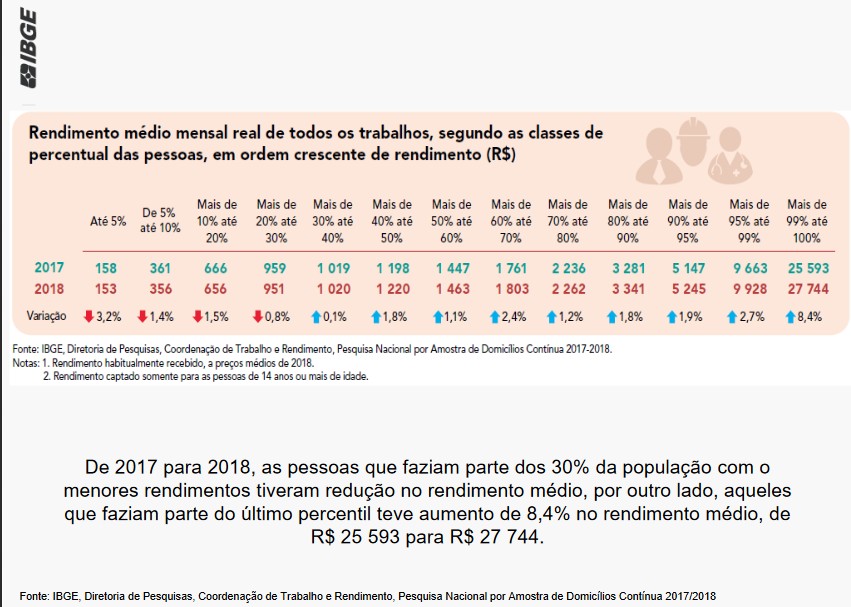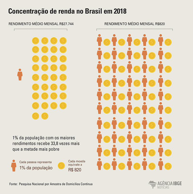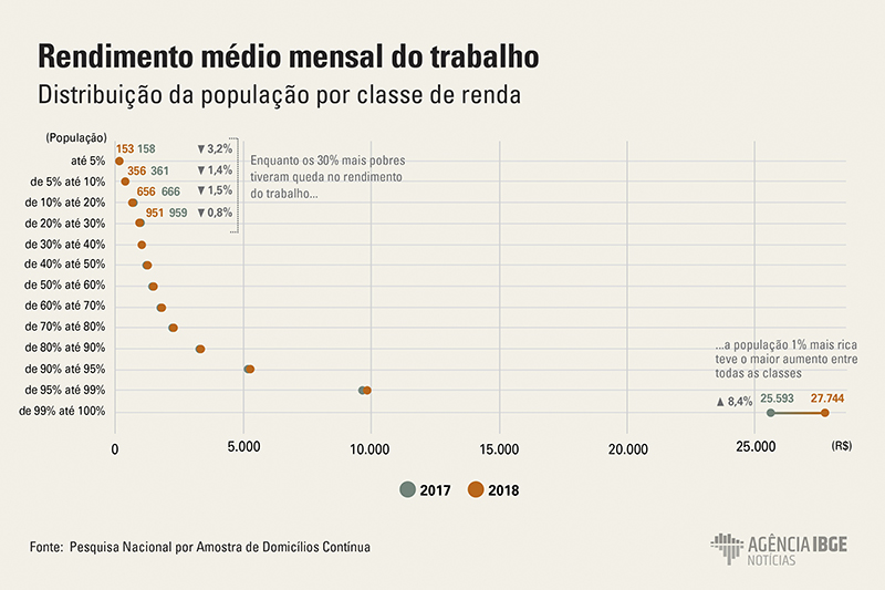 Agência IBGE — O rendimento médio mensal de trabalho da população 1% mais rica foi quase 34 vezes maior que da metade mais pobre em 2018. Isso significa que a parcela de maior renda arrecadou R$ 27.744 por mês, em média, enquanto os 50% menos favorecidos ganharam R$ 820.