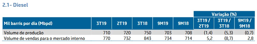 O volume de produção de diesel no país vem caindo: era 750 mil barris por dia no terceiro trimestre de 2018, caiu para 720 mil no segundo trimestre e agora é de 710 mil barris/dia.