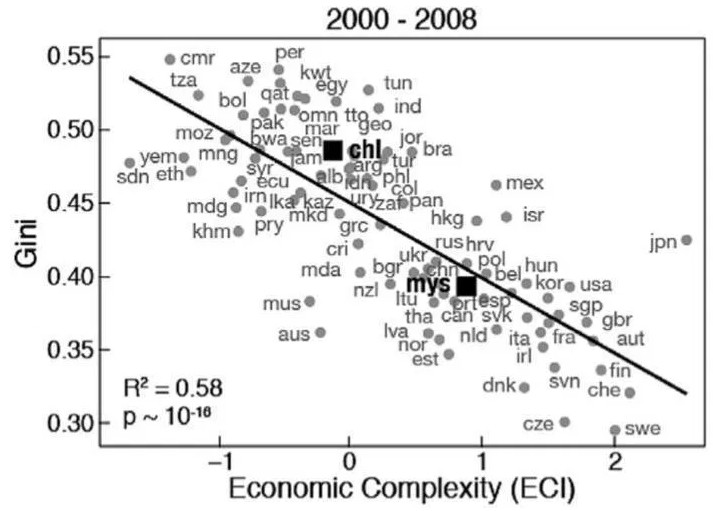 O Chile é desigual pois tem um sistema produtivo ruim, com baixa complexidade e pouca sofisticação. Faltam oportunidades, faltam bons empregos e faltam bons salários: não tem nem empresas nem produtos para gerar essas oportunidades. Um produto sofisticado ou complexo requer maiores habilidades produtivas e, portanto, gera salários mais altos. Um produto sofisticado ou complexo gera uma divisão de trabalho relativamente extensa e isso leva à criação de empregos. Assim, um produto sofisticado ou complexo constrói uma classe média forte. Um produto sofisticado ou complexo gera longas “escadas de carreira”. Isso é importante porque promove a mobilidade social entre os grupos de renda. Uma maior coleção de produtos sofisticados ou complexos na pauta de exportação de um país gera maior “spill over” salarial para outros setores e empregos.
