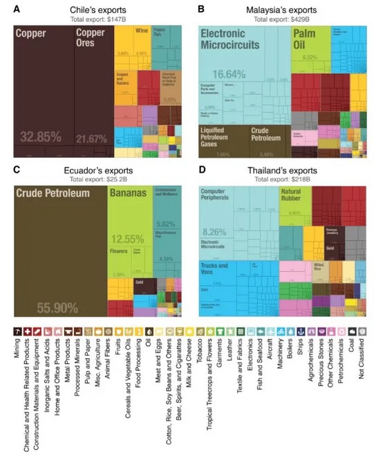 Países produtores de cobre no mundo são mais desiguais (guardadas as devidas questões idiossincráticas) do que todos países produtores de máquinas e peças necessárias para a produção de papel. A comparação abaixo entre Chile e Malásia é bem ilustrativa. Chile com renda per capita PPP de 21,044U$ e escolaridade média de 9,8 anos, com Gini de 0,49 e posição 72 (ruim) no ranking de complexidade produtiva em 2012. Malásia com renda per capita próxima de 22.314U$ PPP, 9,5 anos de escolaridade média, Gini de 0,39 e posição de 24 no ranking de complexidade econômica, patamar bem melhor do que o chileno.