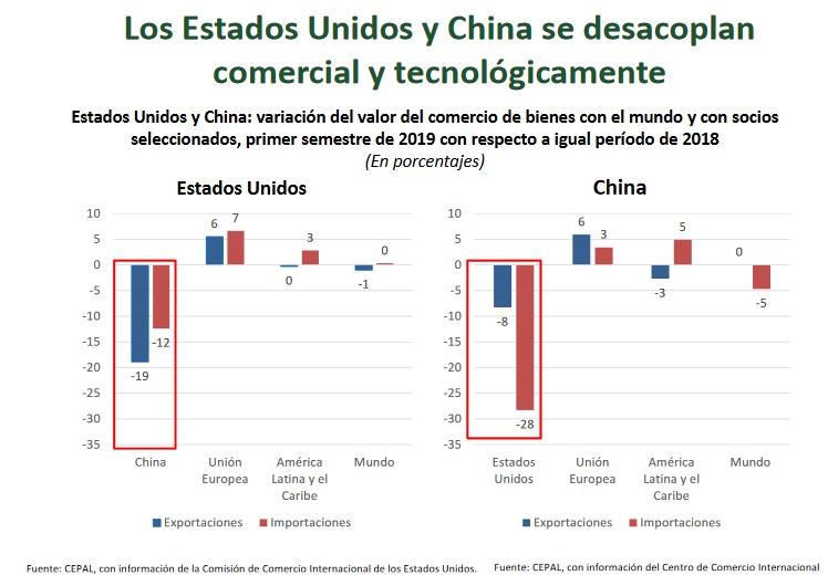 Segundo a CEPAL, isso reflete sua menor dependência dos produtos básicos e seu maior vínculo comercial com os Estados Unidos, cuja demanda de importações mostrou uma maior resiliência do que a de outros mercados principais de exportação da região. Em particular, o México beneficiou-se das oportunidades de substituir os produtos chineses no mercado dos Estados Unidos e durante 2019 tornou-se o sócio comercial mais importante desse país.