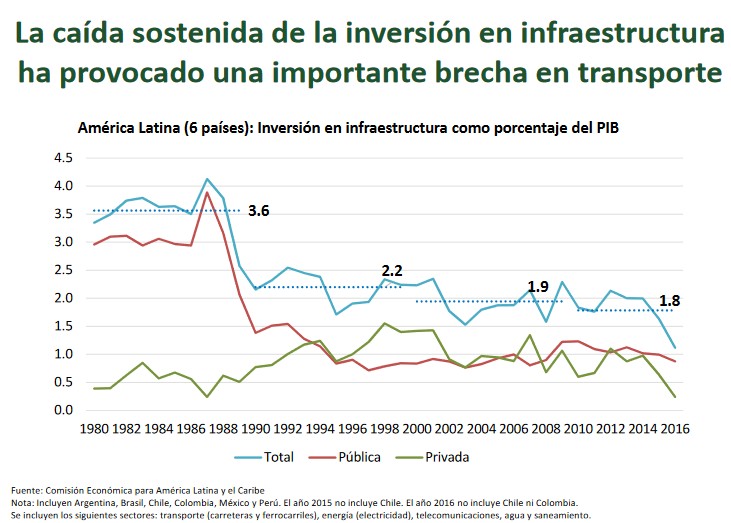 A CEPAL estimou que, para fechar a brecha regional de infraestrutura, teria que investir anualmente, 6% do PIB entre 2016 e 2030. Isso contrasta com o valor investido em um grupo de seis países (Argentina, Brasil, Chile, Colômbia, México e Peru), cujo nível médio de investimento ficou abaixo de 2% do PIB durante esse século.