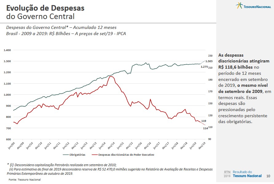O gráfico com evolução das despesas do governo central mostra uma divergência crescente entre as despesas obrigatórias e as discricionárias.