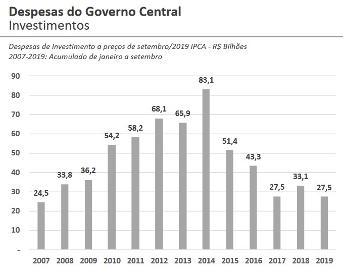 No acumulado de 9 meses até setembro, os investimentos do governo central caíram para 27,5 bilhões, contra R$ 33,1 bilhões no mesmo período de 2018, e muito distante dos R$ 83,1 bilhões investidos em 2014.