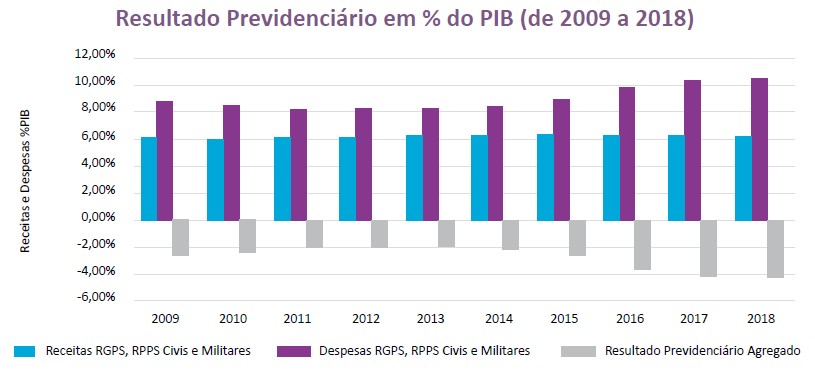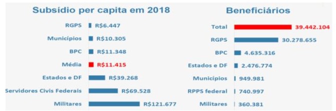 Em 2018, o subsídio per capita médio foi de R$ 11 mil para quase 40 milhões de beneficiários. O RGPS tem a maior quantidade de beneficiários e o menor déficit per capita. Por outro lado, o Sistema de Proteção dos Militares das Forças Armadas tem a menor quantidade de beneficiários e o maior déficit per capita.
